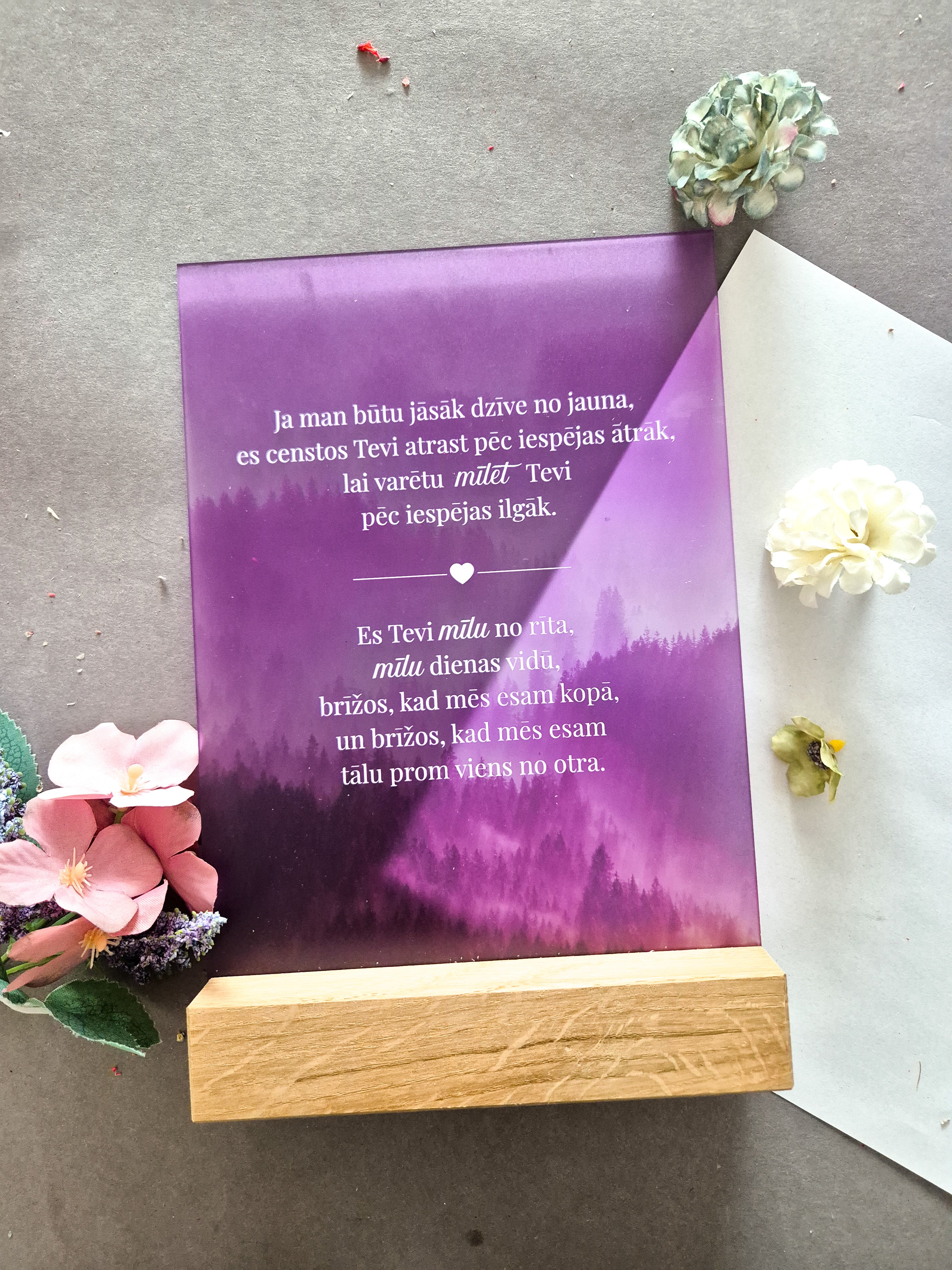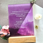 Izvēlieties šo 15x21 cm matēto organiskā stikla dekoru, lai izteiktu sirsnīgas sajūtas. Novietots elegantā ozola statīvā un ar puscaurspīdīgu, augstas kvalitātes UV apdruku, tas ir ideāls risinājums sirsnīgai dāvanai.