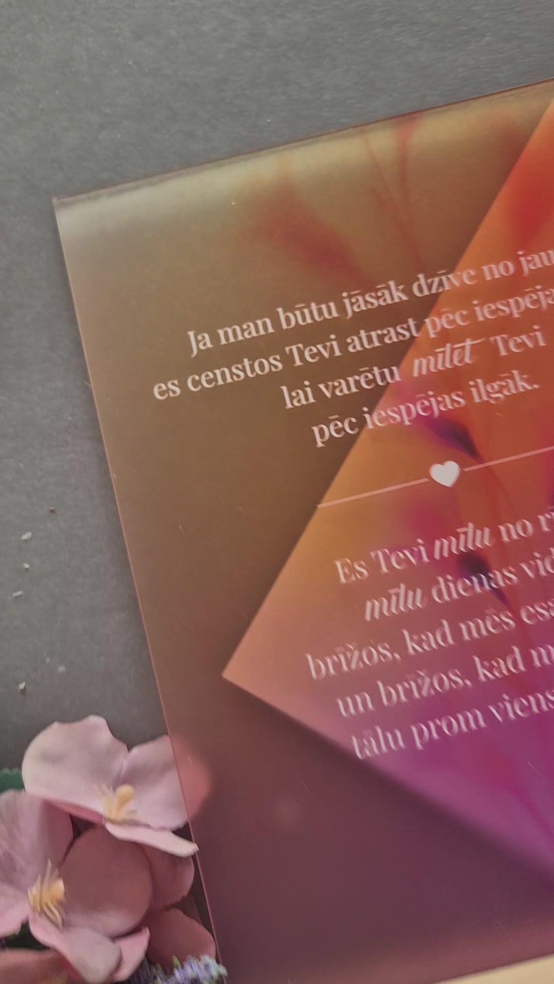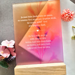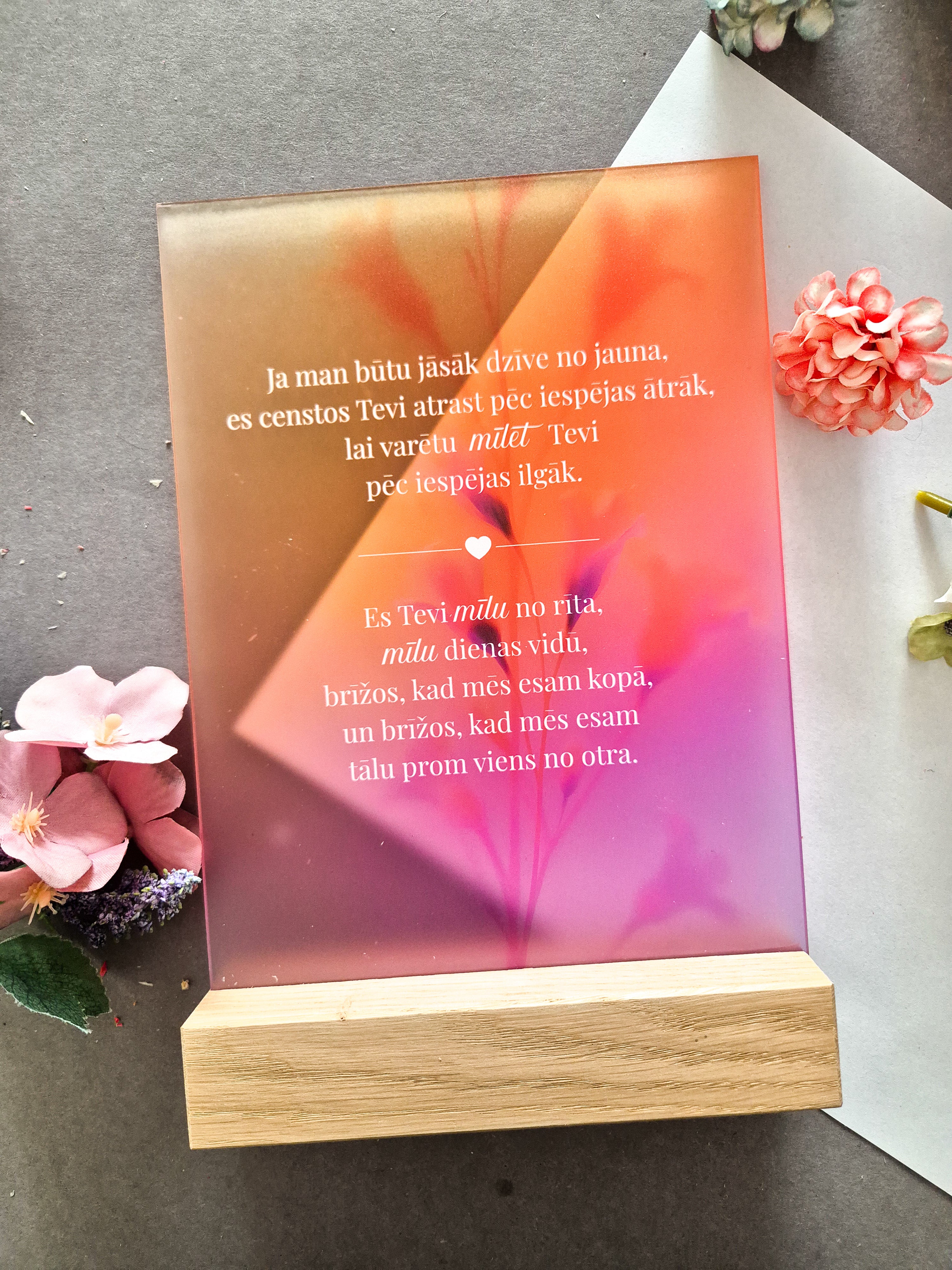 Izvēlieties šo 15x21 cm matēto organiskā stikla dekoru, lai izteiktu sirsnīgas sajūtas. Novietots elegantā ozola statīvā un ar puscaurspīdīgu, augstas kvalitātes UV apdruku, tas ir ideāls risinājums sirsnīgai dāvanai.