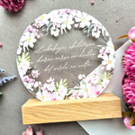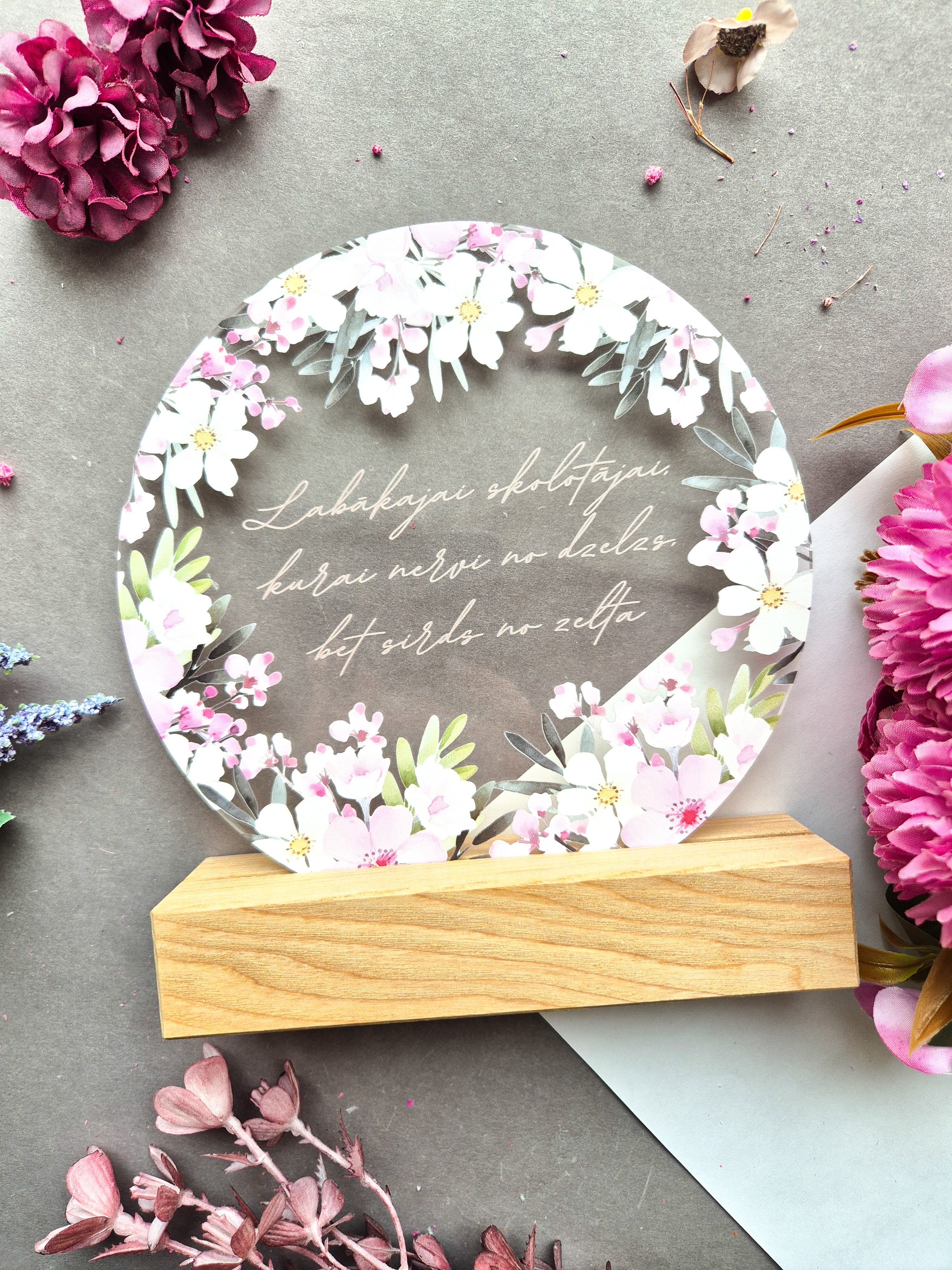 Apdrukāts organiskais stikls ozola statīvā.