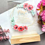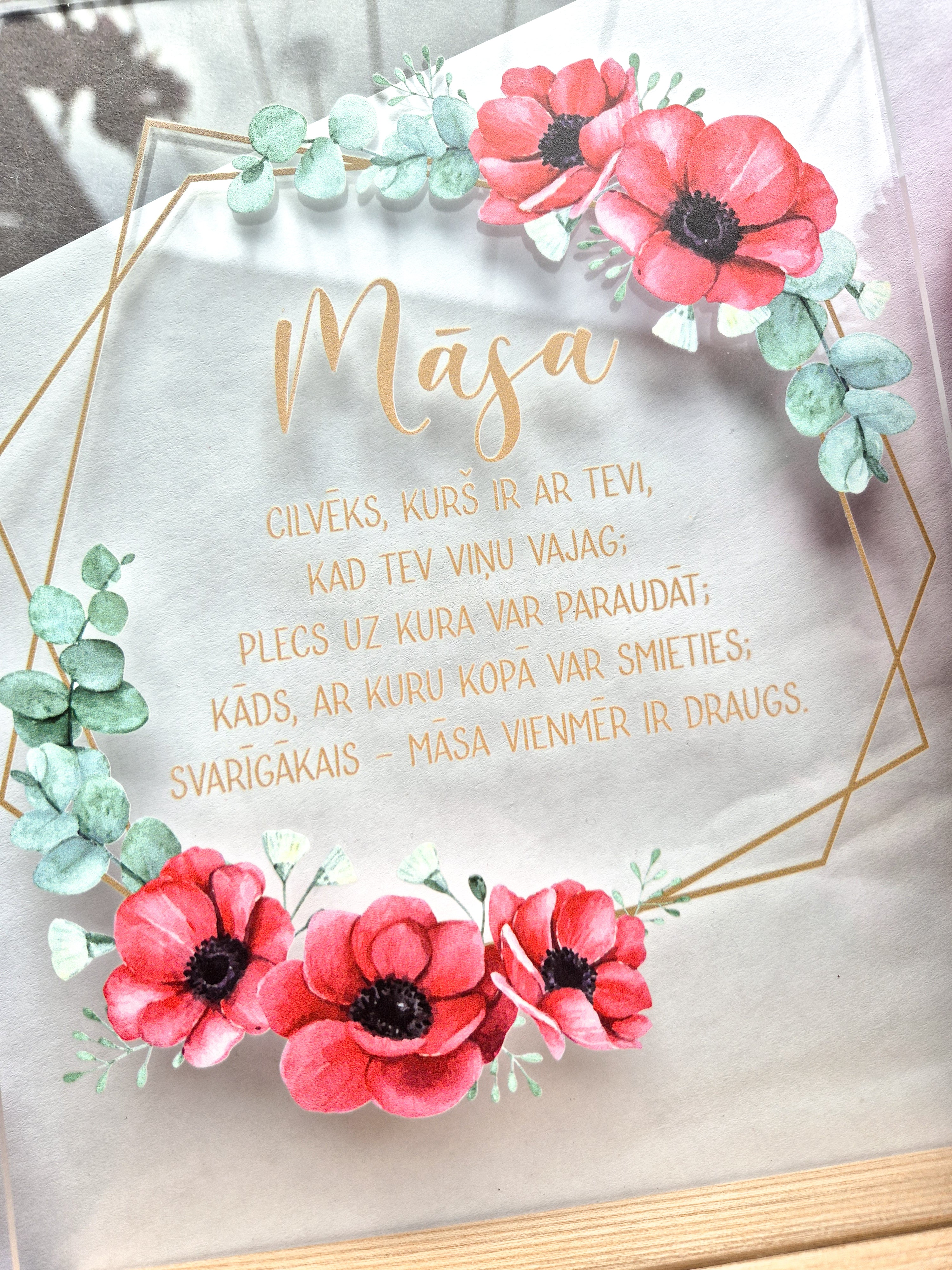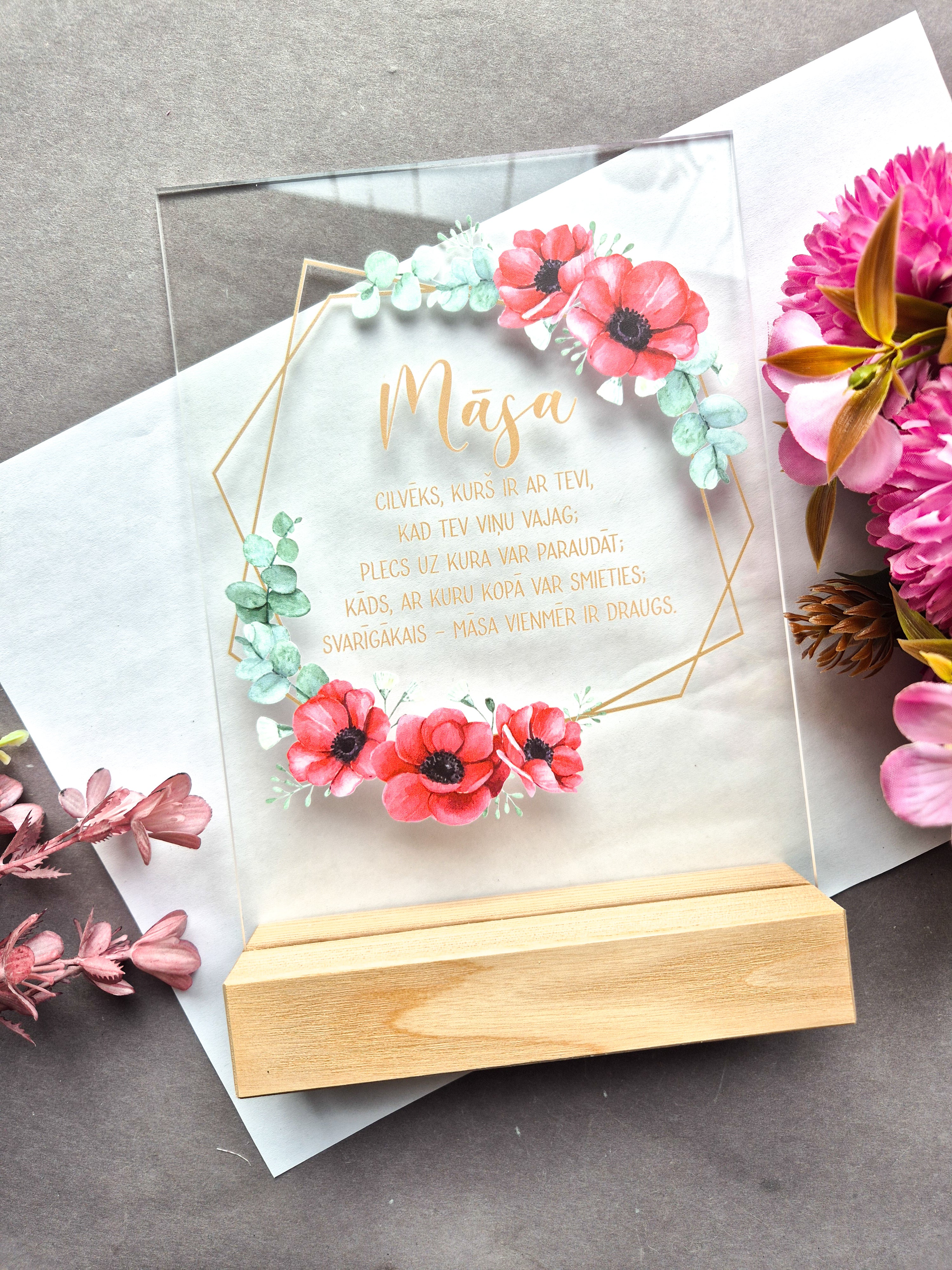 Apdrukāts organiskais stikls ozola statīvā.