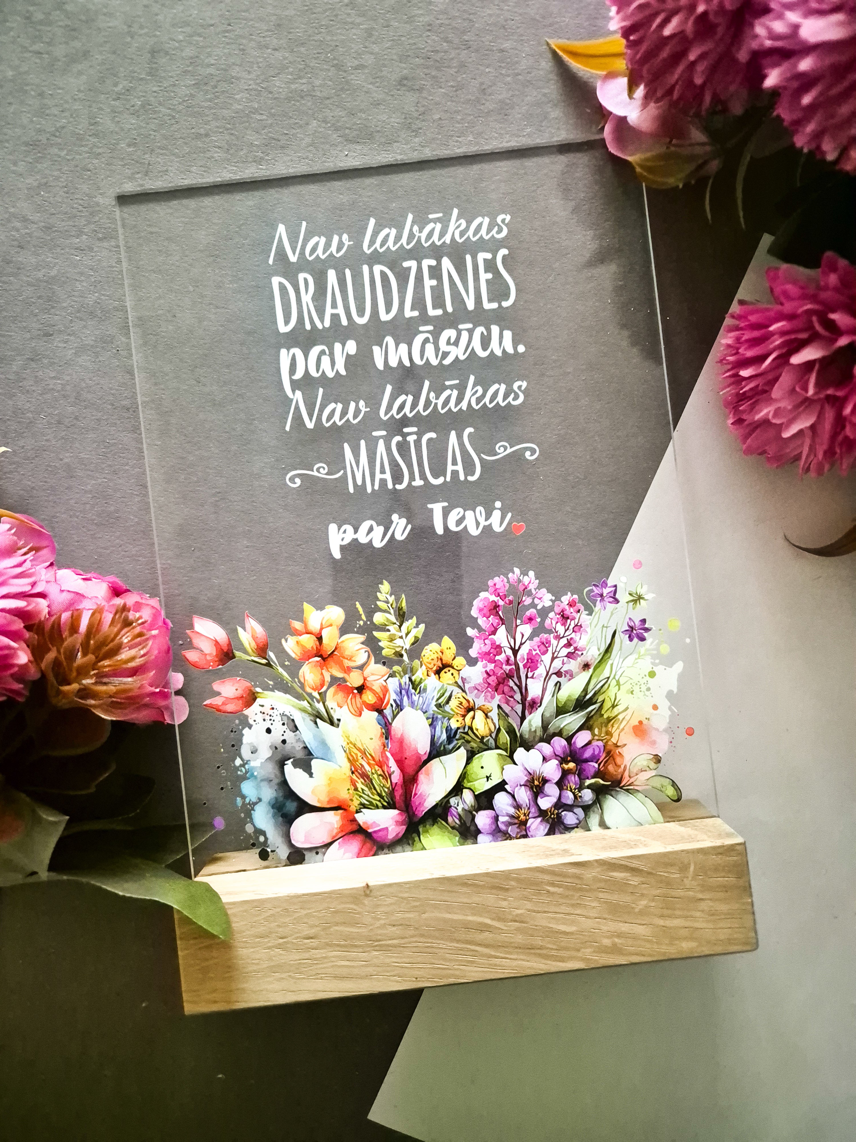 Printed organic glass in an oak stand.