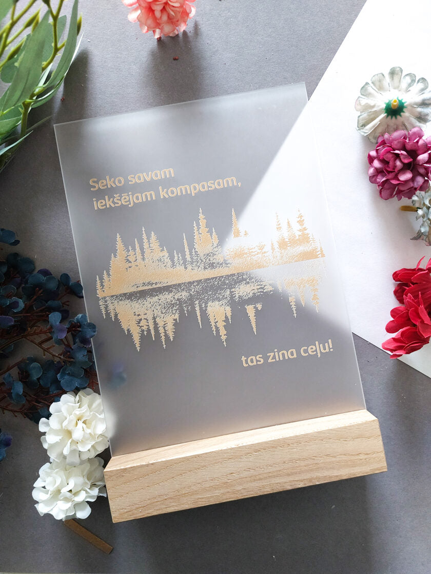 Printed organic glass in an oak stand.