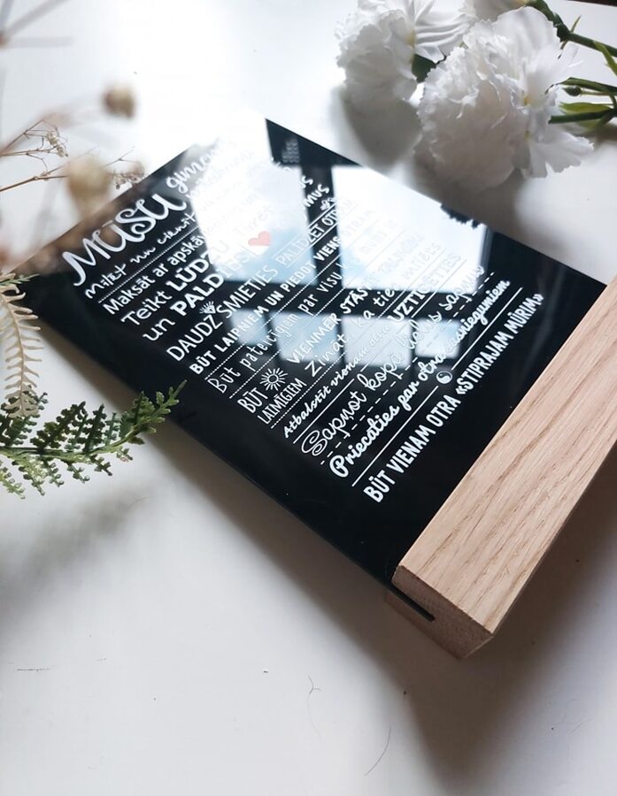 Printed organic black-tinted glass in an oak stand.